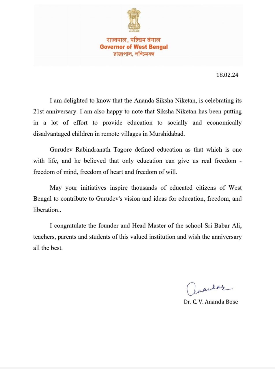 Mr.Babar Ali, Founder and Headmaster of Ananda Siksha Niketan is with Honourable Governor of West Bengal Respected Dr.C. V Ananda Bose Sir